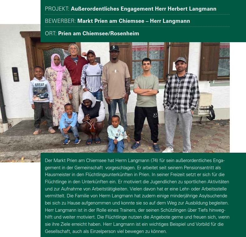Der Markt Prien am Chiemsee hat Herrn Langmann (74) für sein herausragendes Engagement in der Gemeinschaft vorgeschlagen.