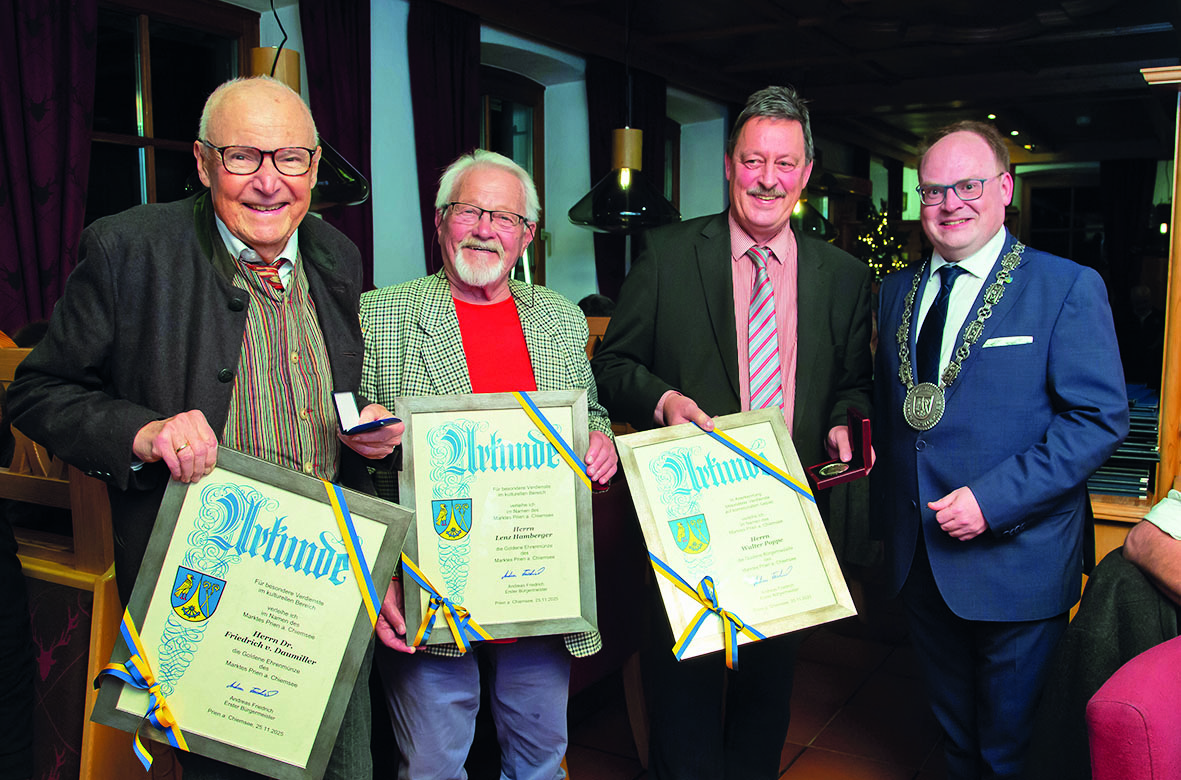 Wie Erster Bürgermeister Andreas Friedrich erklärte, habe Fritz von Daumiller den Kulturförderverein 1985 gegründet und sei 36 Jahre lang dessen Erster Vorsitzender gewesen. Der 500 Mitglieder zählende Verein zeichne sich seither als tragende Säule für das kulturelle Leben von Prien aus. Seiner Initiative sei es – auch aufgrund einer »erheblichen finanziellen Zuwendung« – zu verdanken, dass das Alte Rathaus zur heutigen Galerie umgebaut werden konnte, die nun als kultureller Mittelpunkt fungiere und Kunst ein angemessenes Zuhause biete. Mit seinem Engagement und seinem Verein »Freunde von Herrenchiemsee« habe er es geschafft, dass der Insel-Dom renoviert und letztlich Schloss Herrenchiemsee zum Weltkulturerbe ernannt worden sei. Für seinen jahrzehntelangen Einsatz im Dienste der Gemeinde und für deren kulturelle Entwicklung überreichte Erster Bürgermeister Andreas Friedrich Dr. Friedrich von Daumiller die Goldene Ehrenmünze des Marktes Prien. Daumiller dankte und erklärte, er freue sich wahnsinnig über die Ehrung. Den Startschuss für die neue Galerie hätte der damalige Gemeinderat gesetzt, indem er beschlossen habe, nach dem Umzug der Verwaltung dieses Gebäude der Kunst zu widmen. Neben der langen Tradition der Chiemsee-Maler blicke Prien auf eine lebendige Künstlerlandschaft, die ein Alleinstellungsmerkmal sei. Es freue ihn, dass der Insel-Dom als eines der ältesten Gebäude von Bayern, nun wieder Besuchern offenstehe. Das Weltkulturerbe von Schloss Herrenchiemsee sei eine gewaltige Aufwertung der Region, die gerade in der Nebensaison Besucher anlocken werde. »Ich werde weiterhin alles tun, dass Prien eine kleine, feine Kunstmetropole zwischen München und Salzburg ist und bleibt«, schloss er seine Rede.